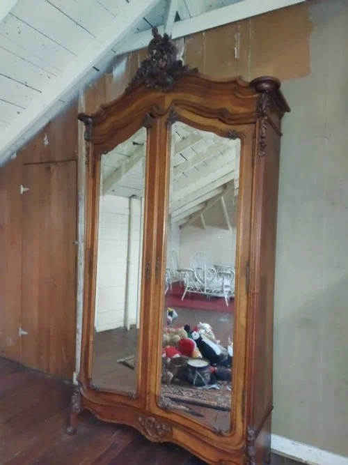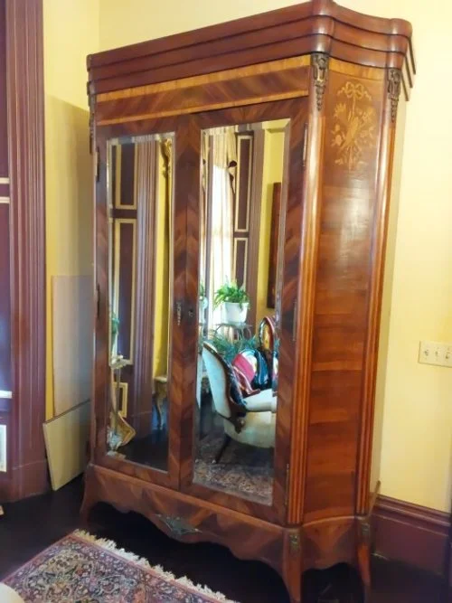 Large armoire- walnut, inlay marquetry, beveled mirrors, dual doors 96"H, 70"W, 25"D