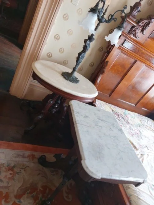 several antique Victorian marble top walnut parlor tables, likely late 19th century