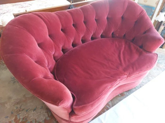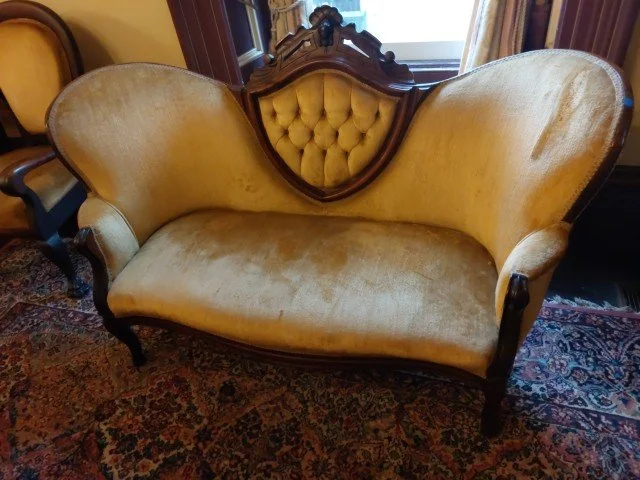 Victorian sofa - walnut w/ yellow velvet upholstery 31"H, 56"L, 20"D