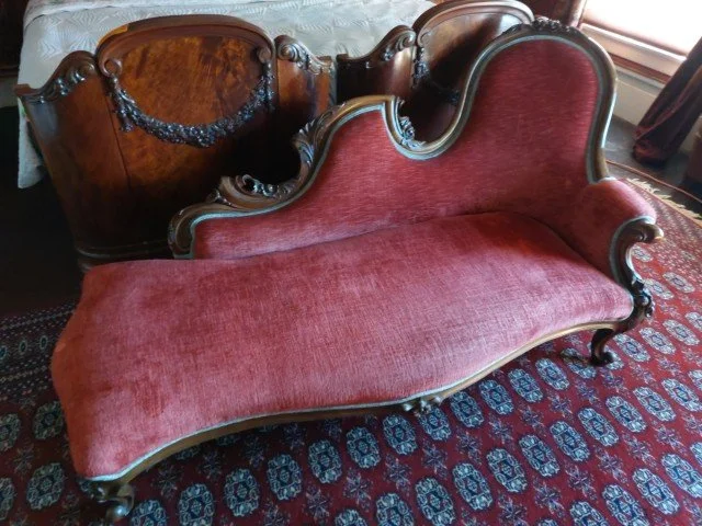 Victorian " Renaissance Revival" chaise lounge-red velvet; walnut carved; sweeping elegant 66"W, 36"H, 31"D