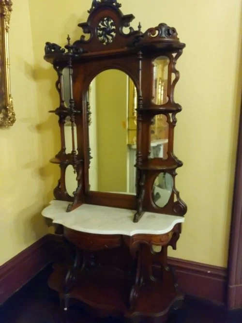 walnut mirrored hall tree / etagere 51”/101”/17”