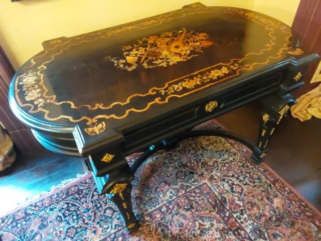 Black inlay table with gold accents - late 20thc-antique / Napoleon (1888) inlaid marquetry table with gilt brass mounts 27"H, 49"W, 29" D